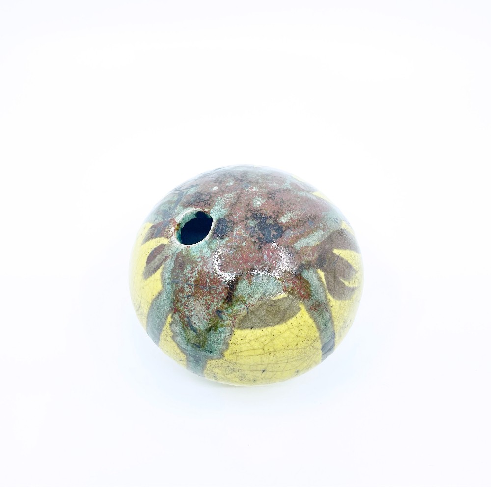 Spherical ceramic vase with floral pattern in yellow and green by Lisa Goldfarb
