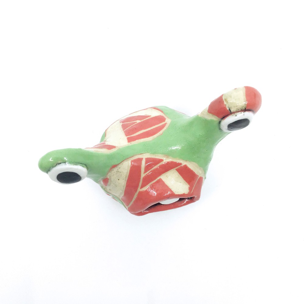 Whimsical ceramic sculpture in shades of green & pink by Emily Farris