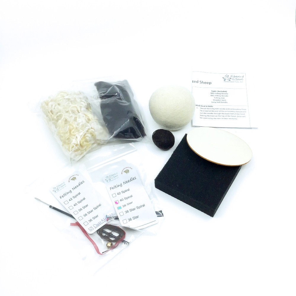 7cm white wool ball, small brown ball, 20g sheep locks, 5-7g brown fiber, embroidery thread, small bell & ribbon, 38 Gauge felting needle, 40 Gauge felting needle, felting mat, wooden base, long doll needle