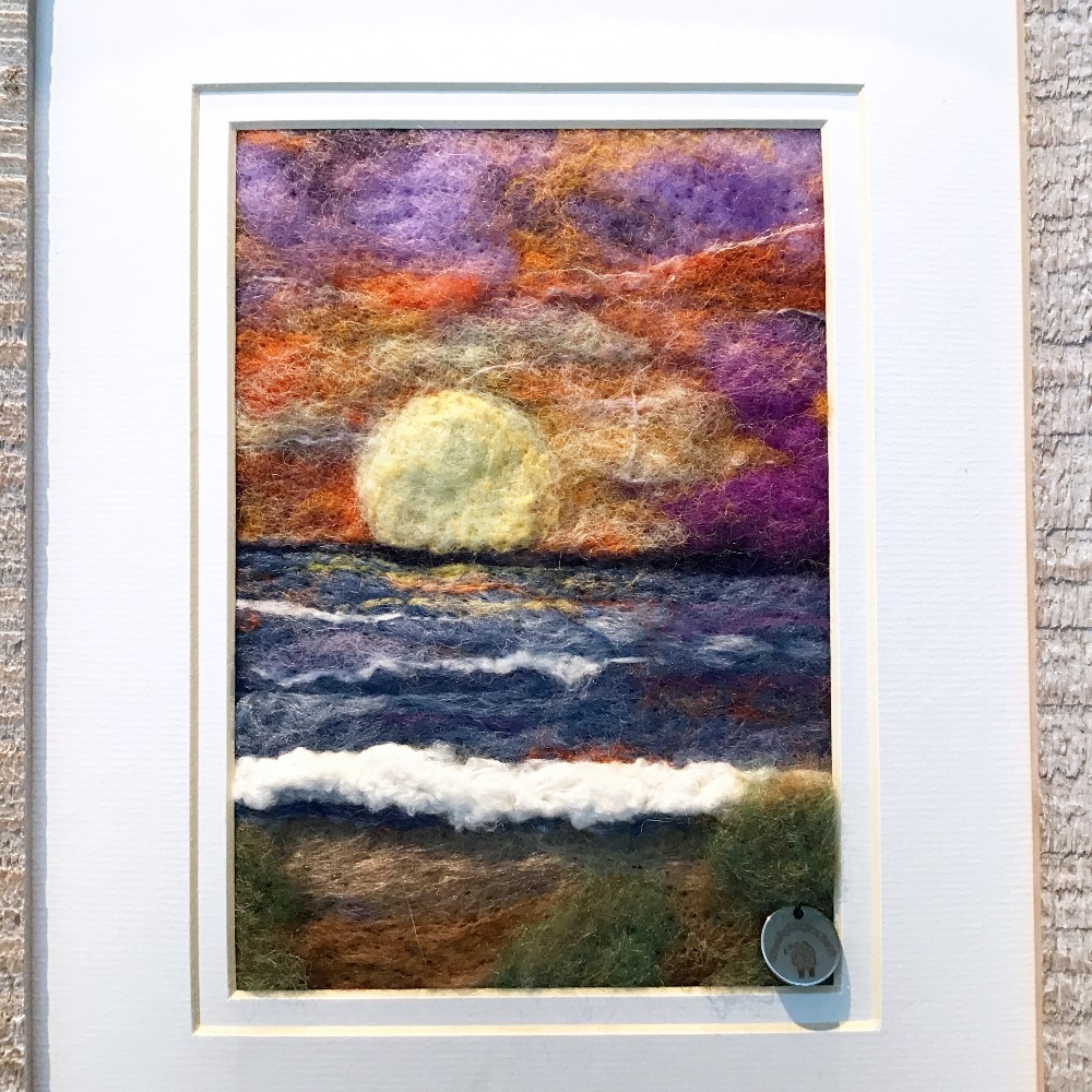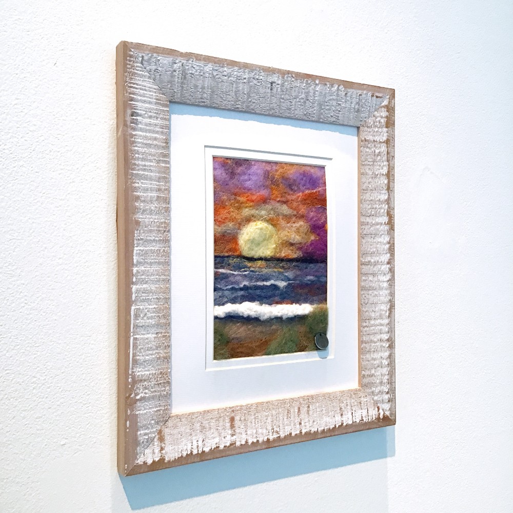 Needle felted landscape wall hanging depicting a beautiful sunset at the oceanside in summer colors by Suzy Gammill.