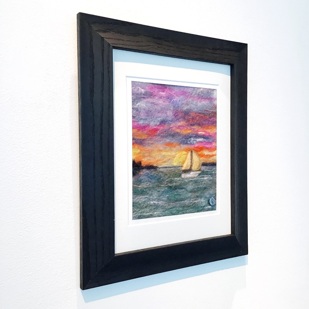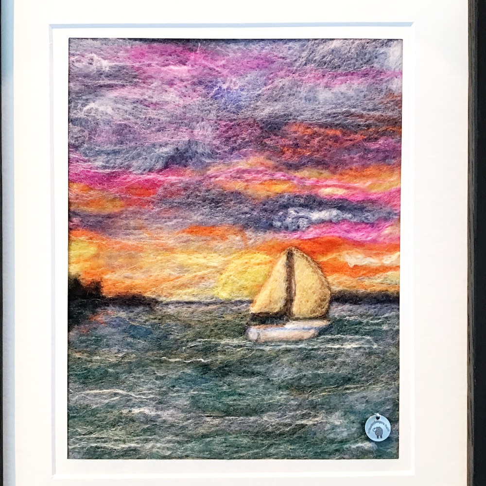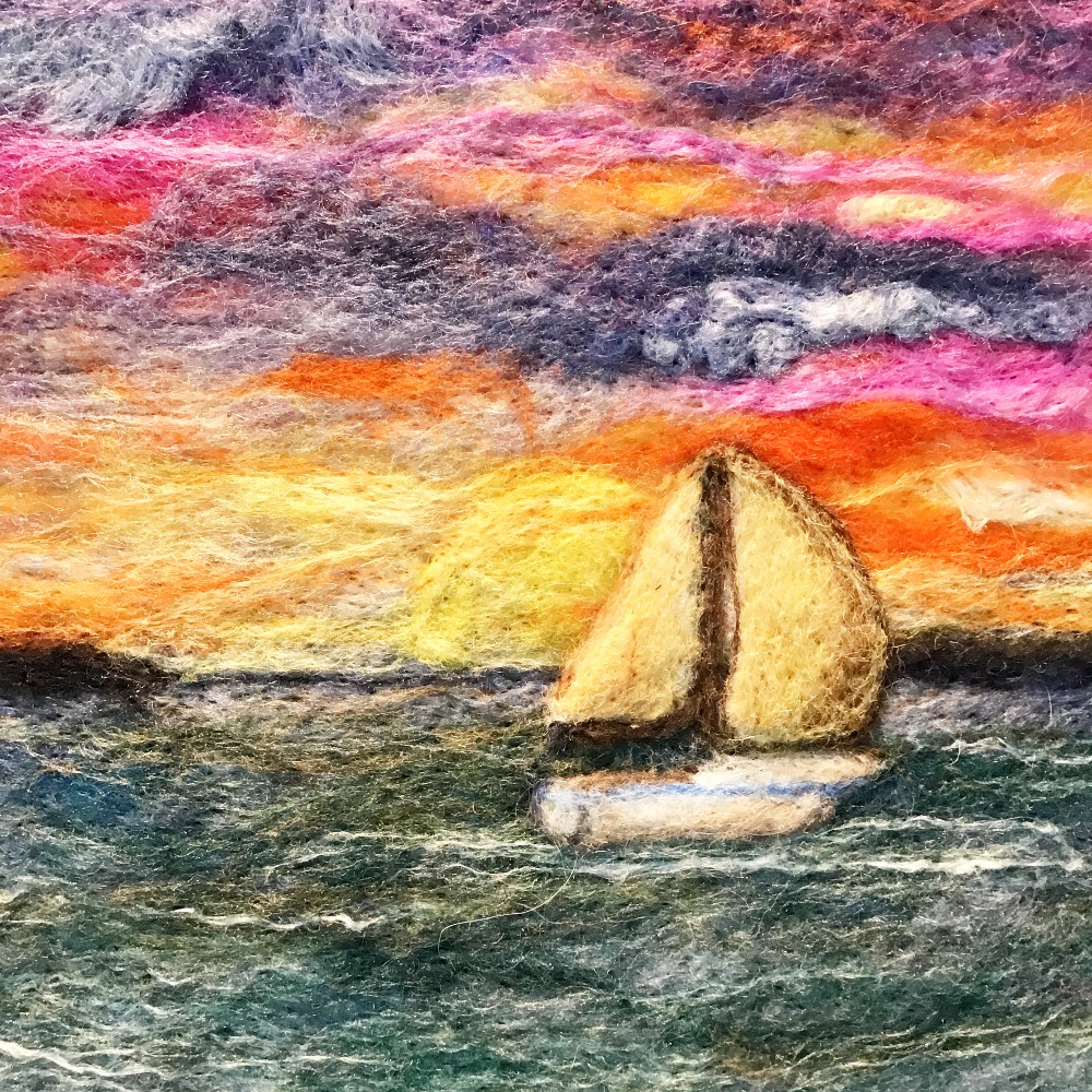 Needle felted landscape wall hanging depicting a sailboat with a sunset in pastel hues by Suzy Gammill