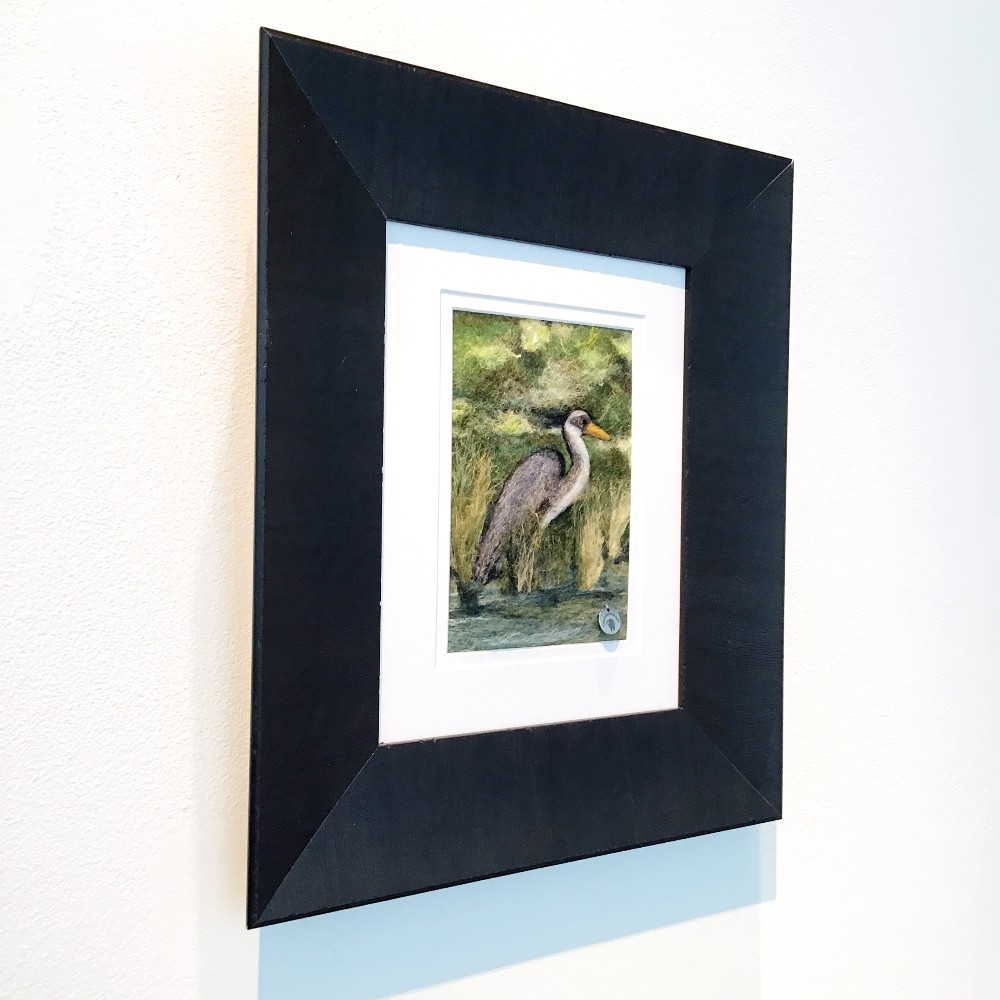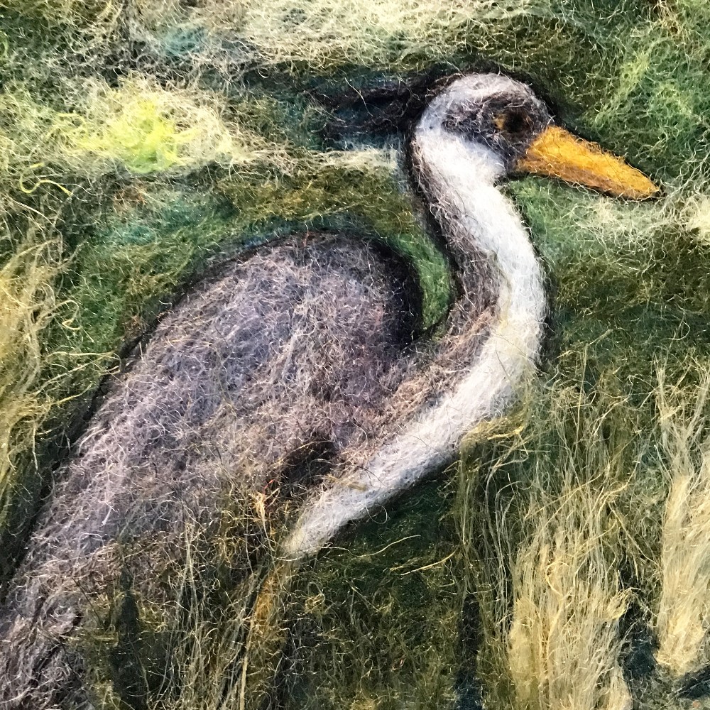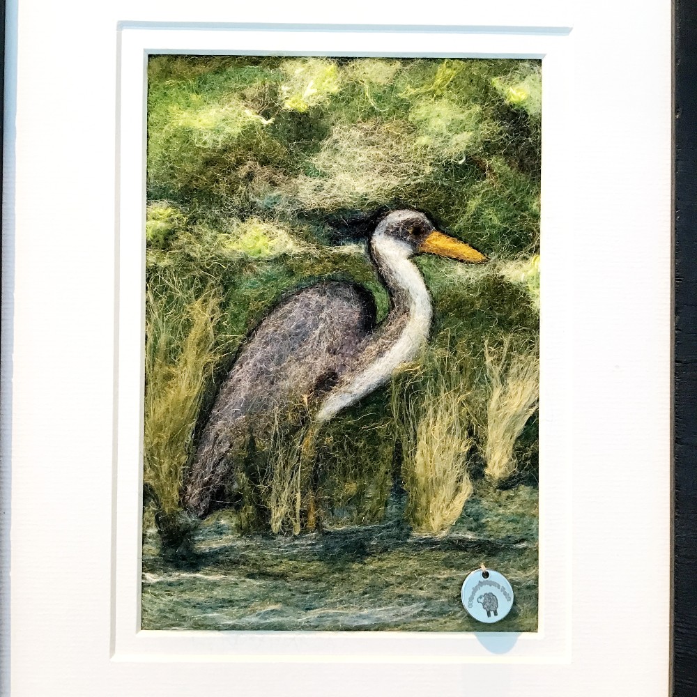 Needle felted wall hanging depicting a grey heron in a creek by Suzy Gammill