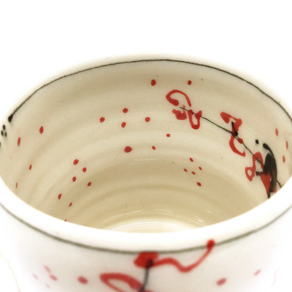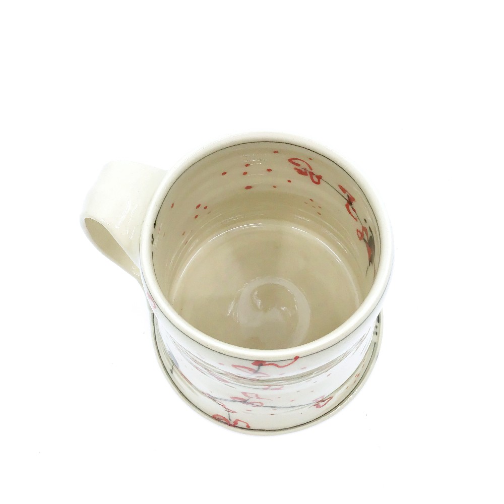 Ceramic mug with hand illustrated elements depicting cherry blossoms and birds by Natalie Reed. Dishwasher and microwave safe with food safe glaze.