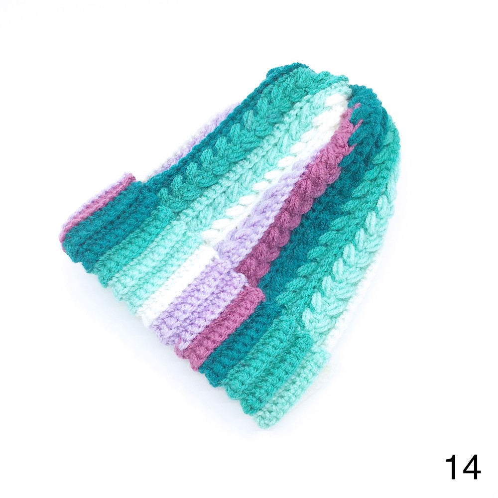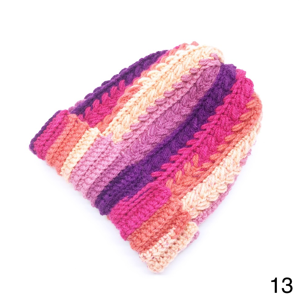 Cozy crocheted caps in a variety of colors by Jen Boyd Martin