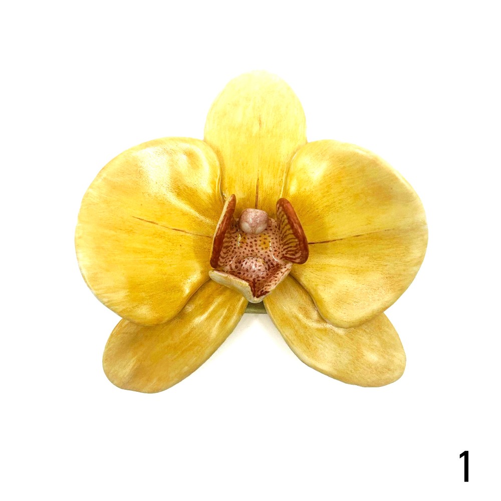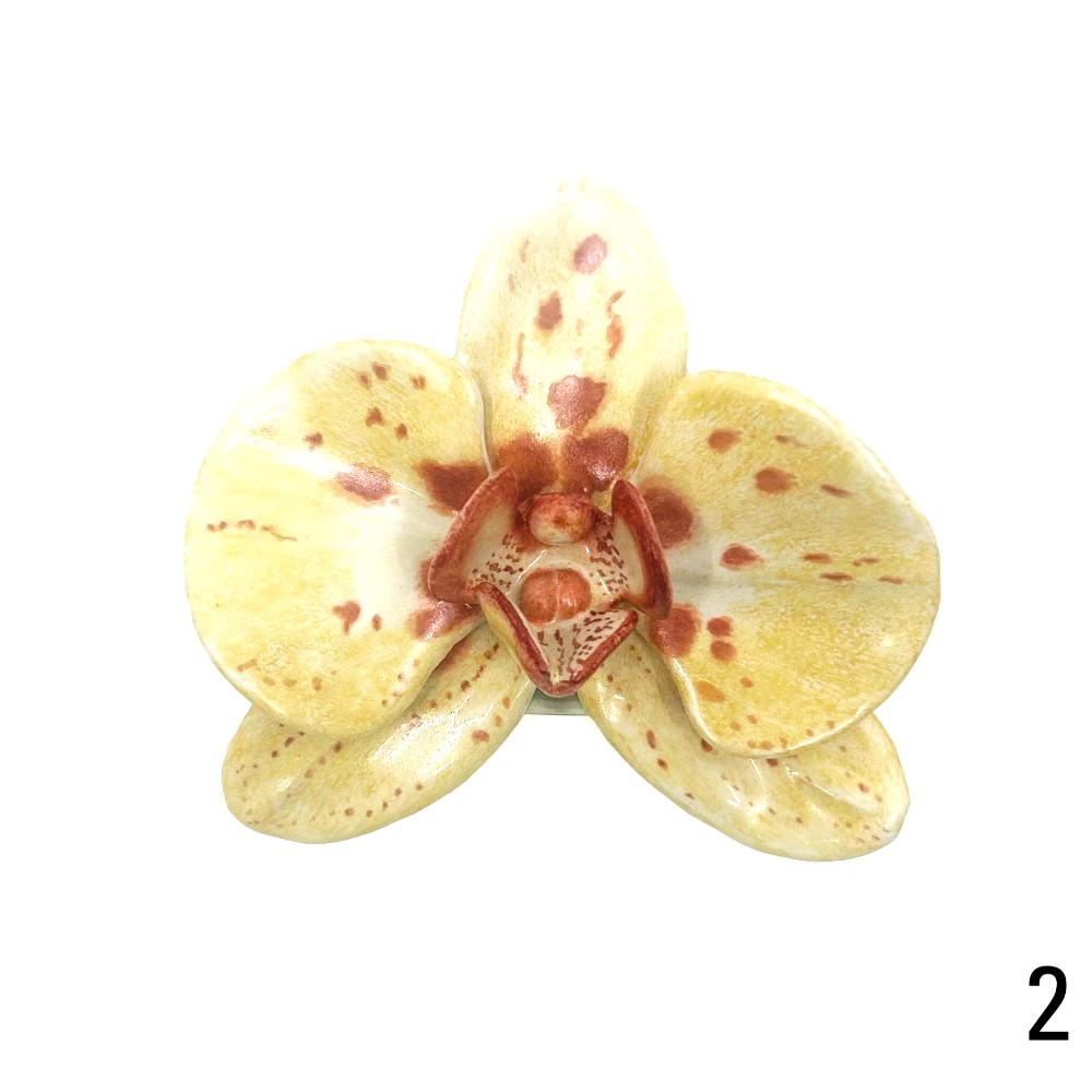 Slab-built porcelain orchid brooch glazed with stoneware and overglaze by Michelle Herholdt. Nickel free metal pin.