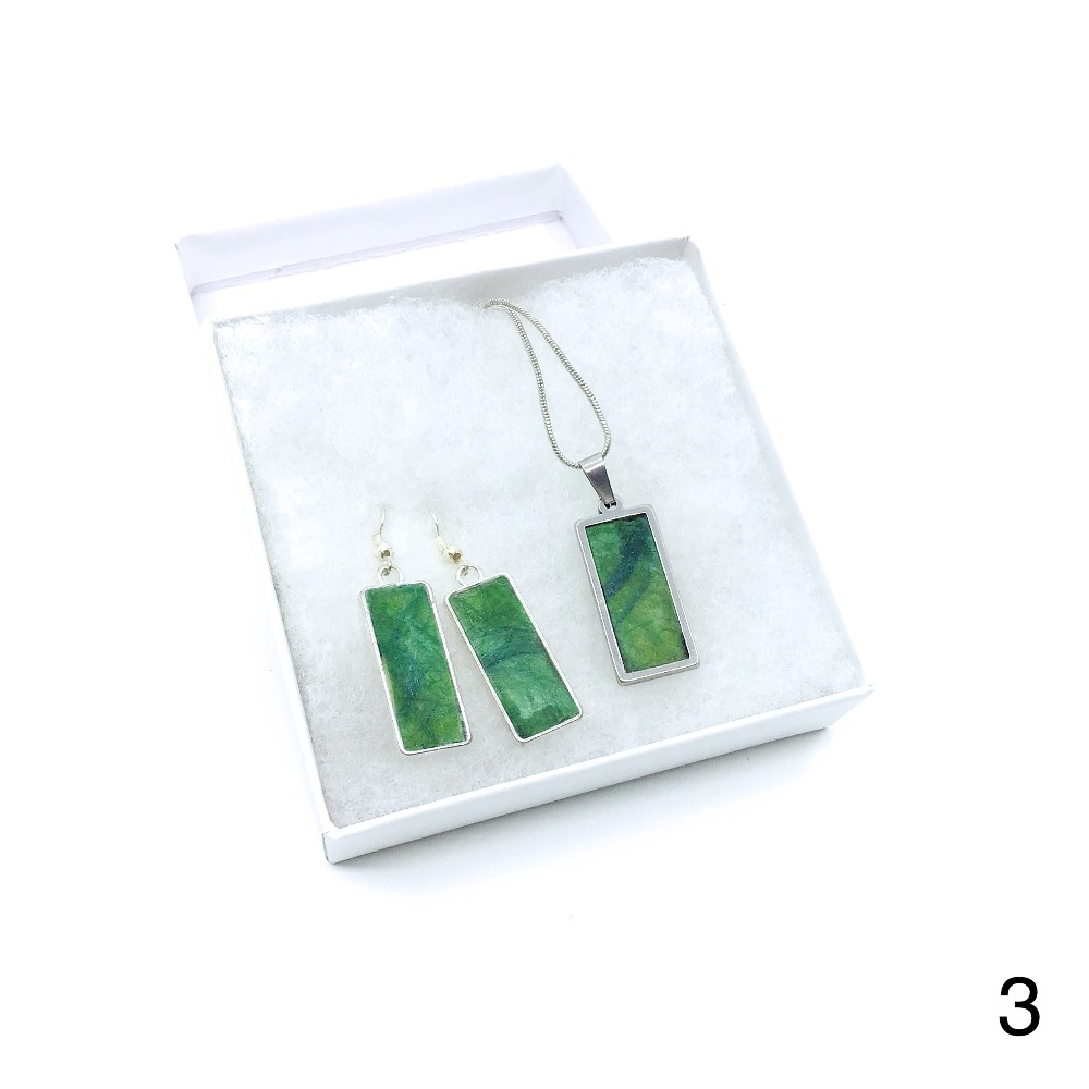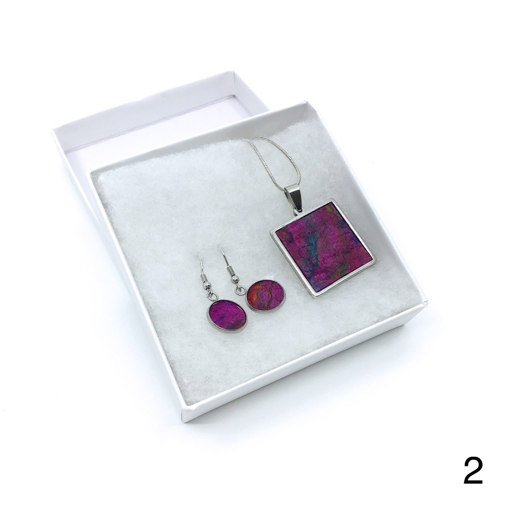 Silk fusion jewelry sets made with sterling silver by Suzy Gammill. Includes earrings & a necklace.