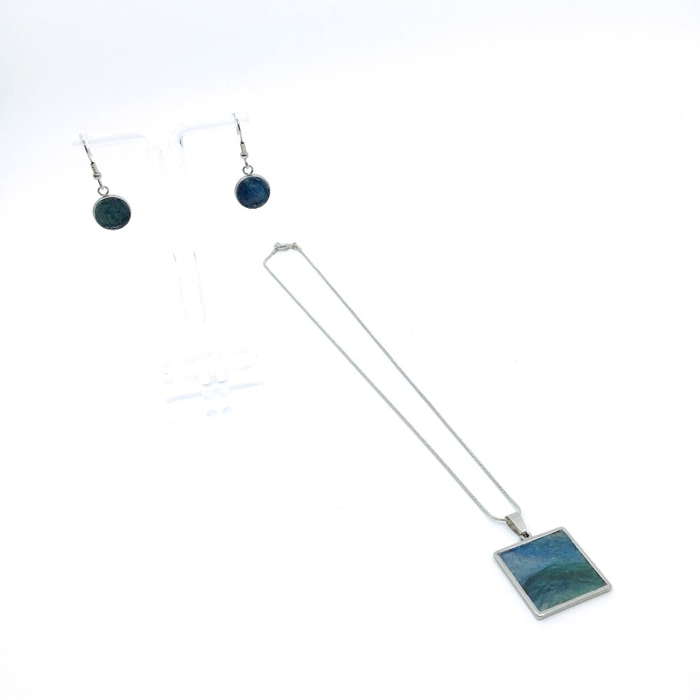Silk; varied sizes (earrings approx. .75" x .75" - 1", necklace chain approx. 16")