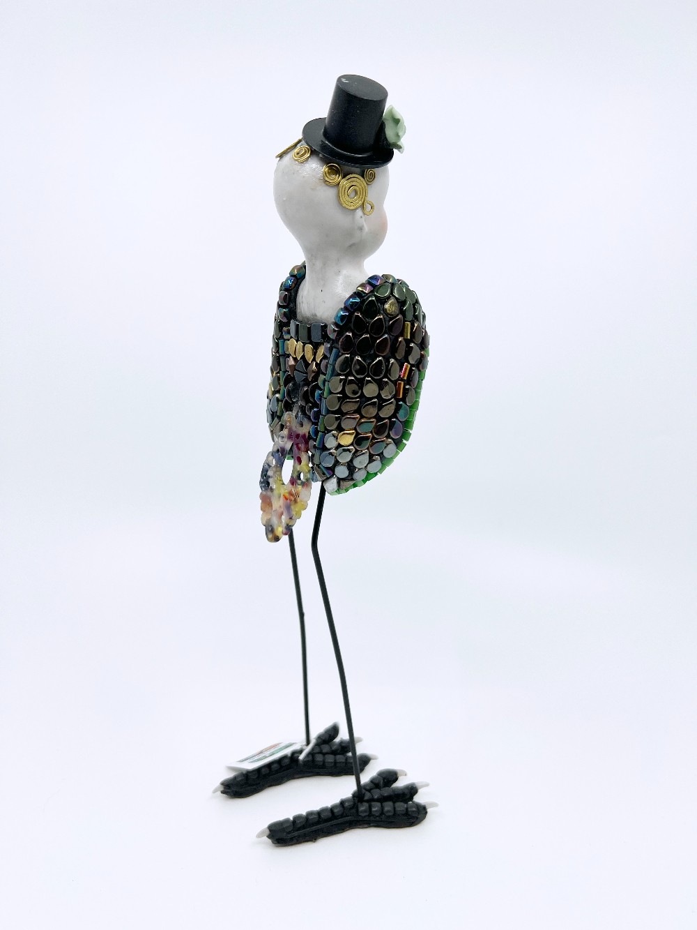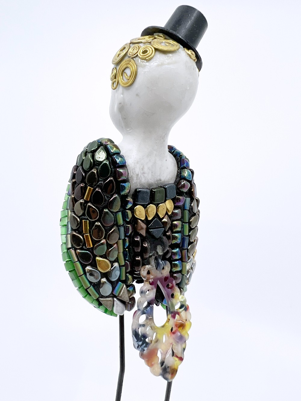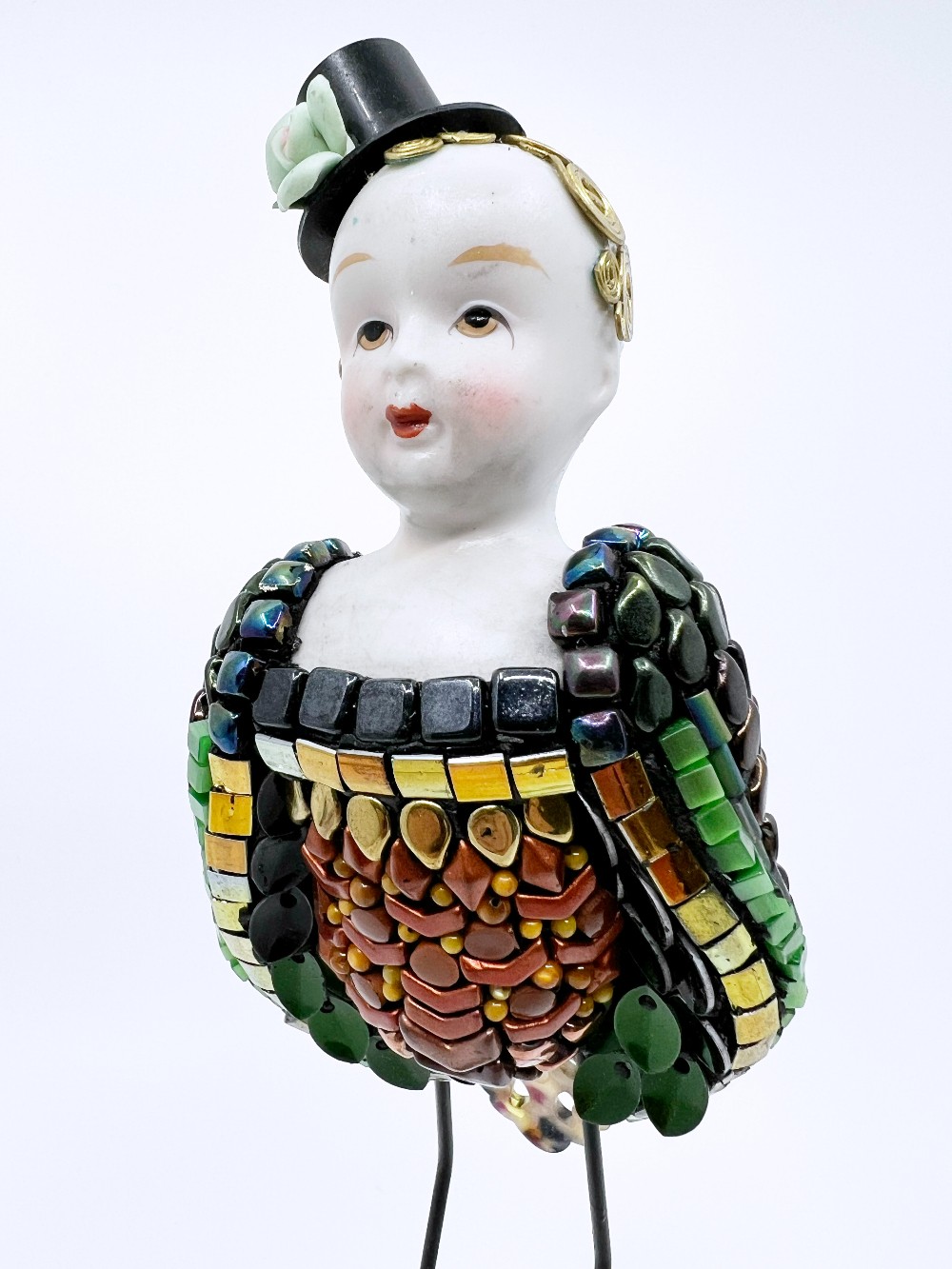 A whimsical mosaic sculpture in natural jewel tones by Caryn Brown