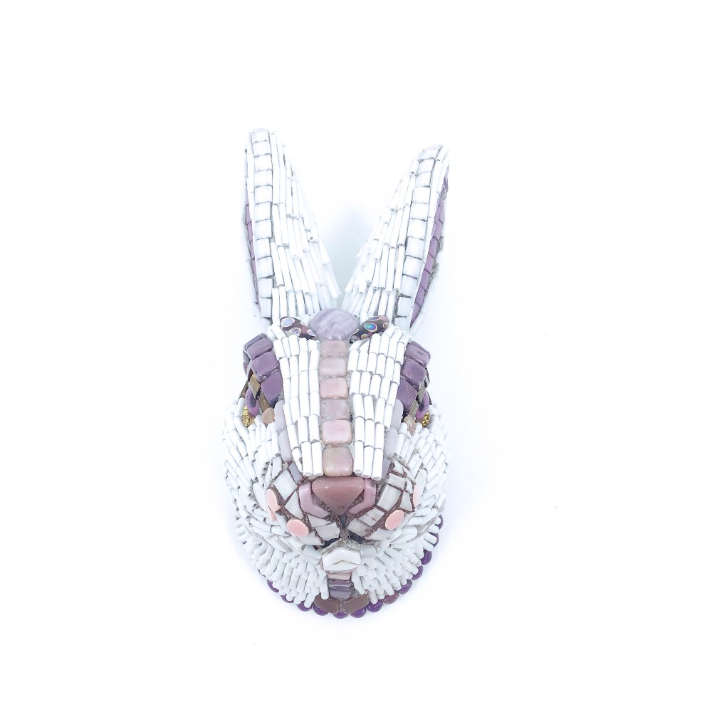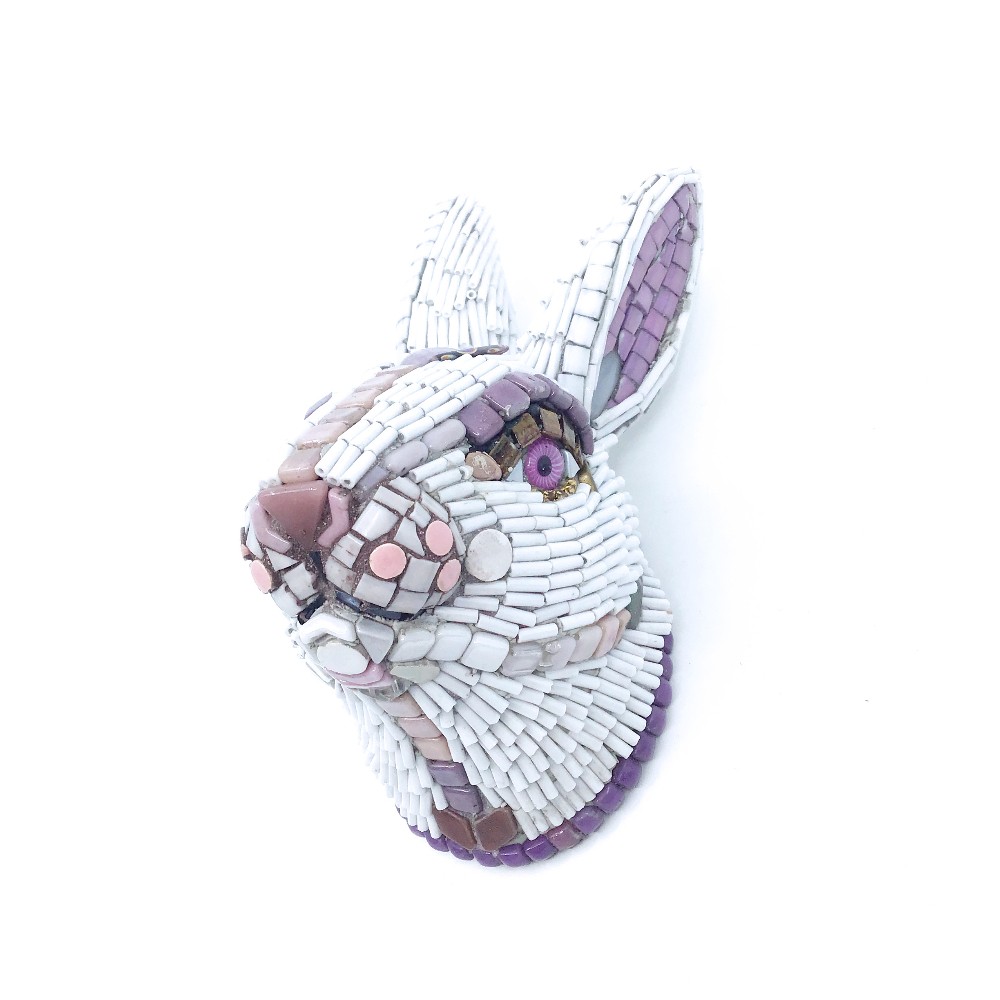 3D mosaic sculpture/wall hanging of a rabbit head by Caryn Brown