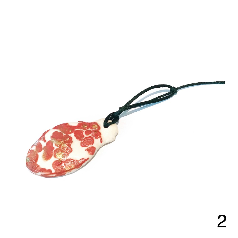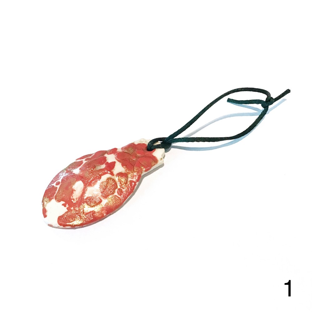 Festive ceramic ornaments with floral patterns in gold and red by Lisa Goldfarb