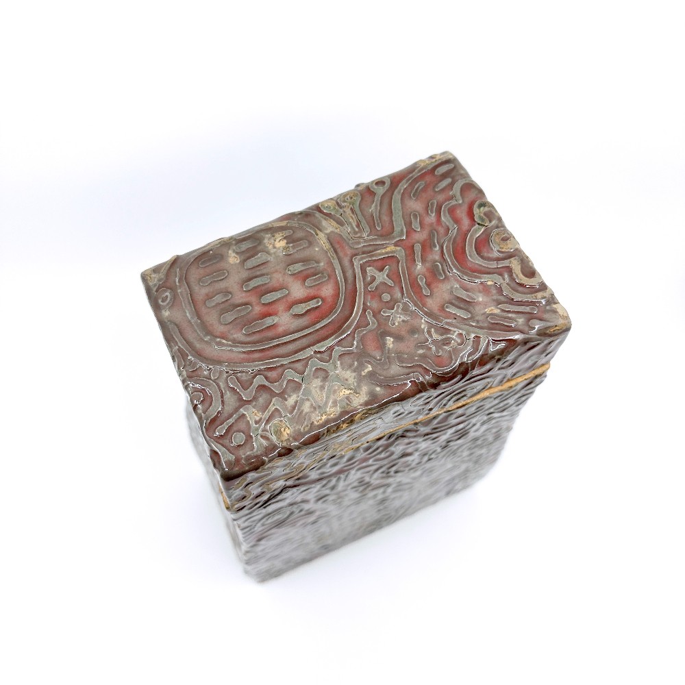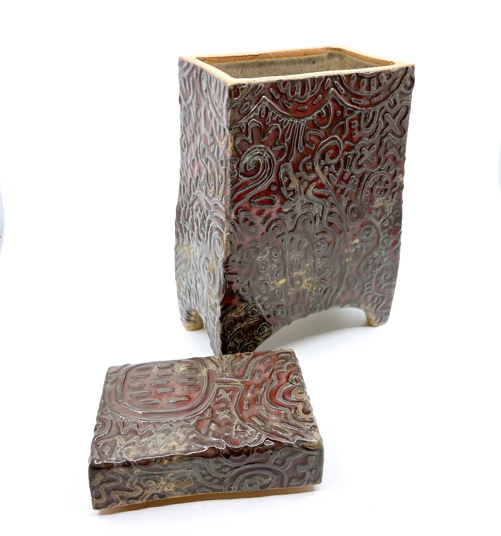 Slab built, slip trailed lidded jar by Ruth Hesse. Wipe with damp cloth.