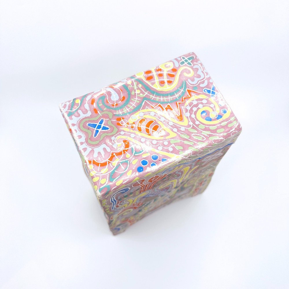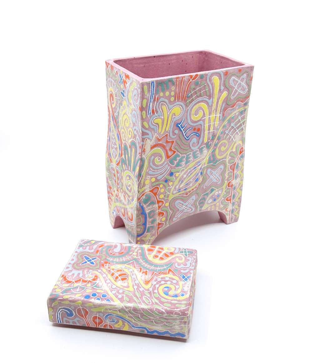 Slab built lidded jar in matte pink with doodled patterns by Ruth Hesse. Wipe with dry cloth.