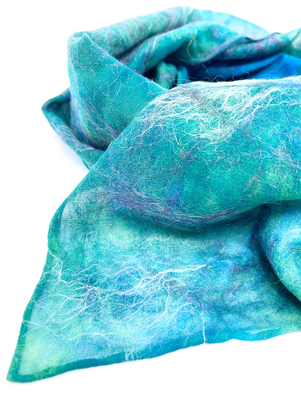 Elegant nuno felt scarf made from silk gauze and wool in cool tones by Taylor Painter-Wolfe. Hand wash cold & lay flat to dry.