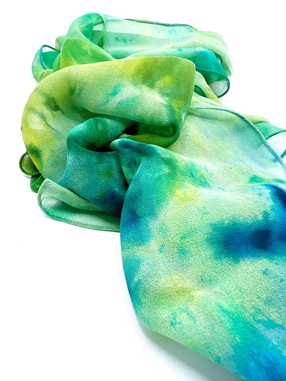 Lightweight silk scarf in shades of blue & green by Taylor Painter-Wolfe. Hand wash cold & lay flat to dry.