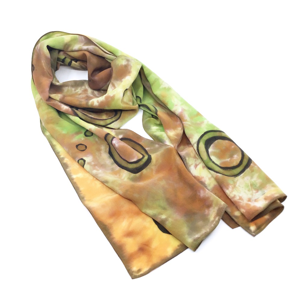 Hand dyed and illustrated silk scarf in earthy tones by Traci Cole.