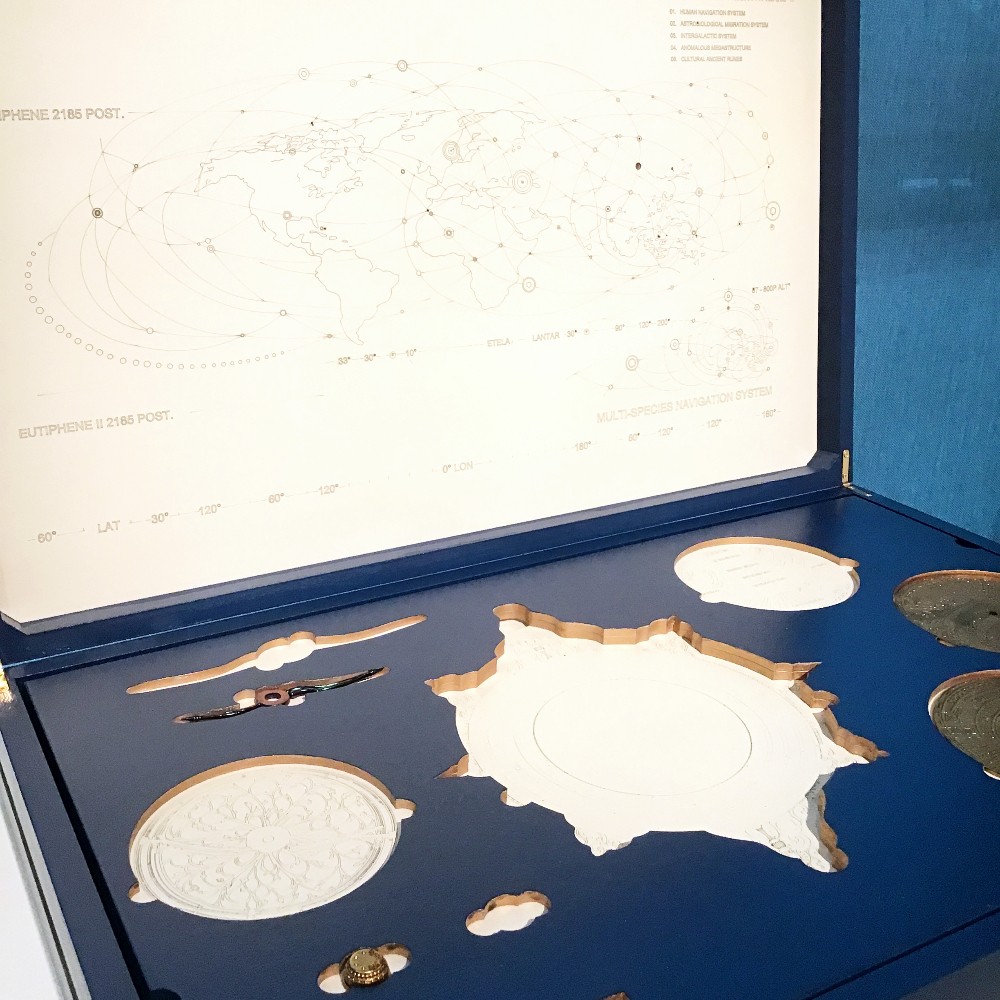 Mixed media including 3D prints, wood, acrylic paint, pigment, metal; Astrolabe: 14" x 11.5" x 1", Field case: 32" x 21" x 6"