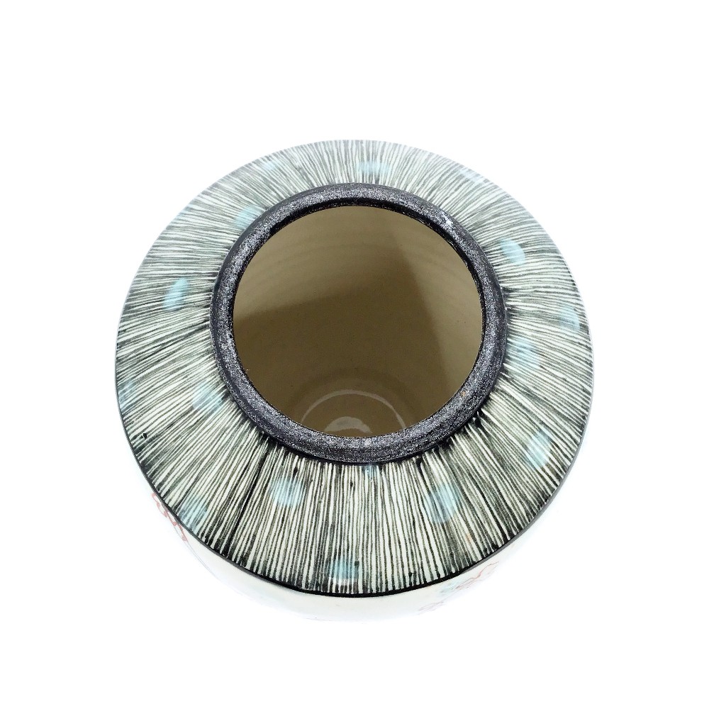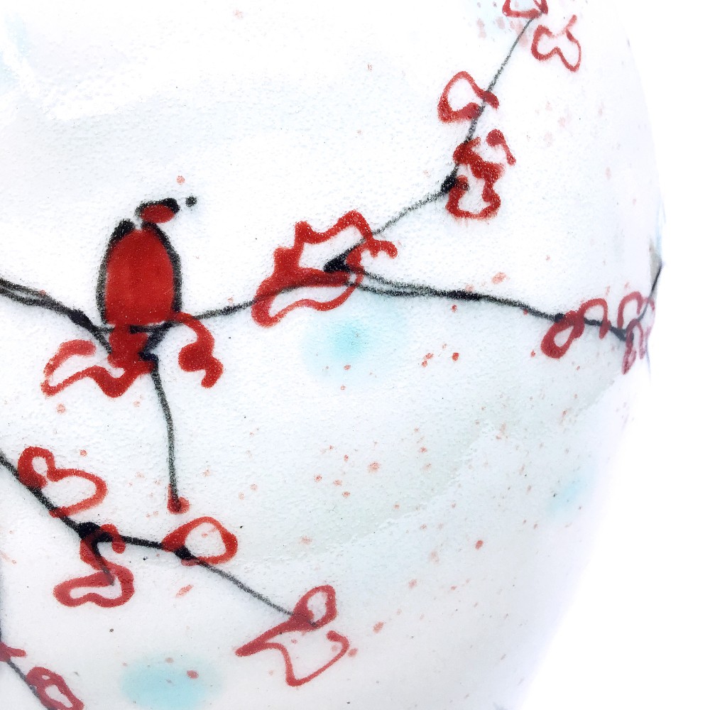 Ceramic vase in aqua with hand illustrated elements of cherry blossoms and birds by Natalie Reed